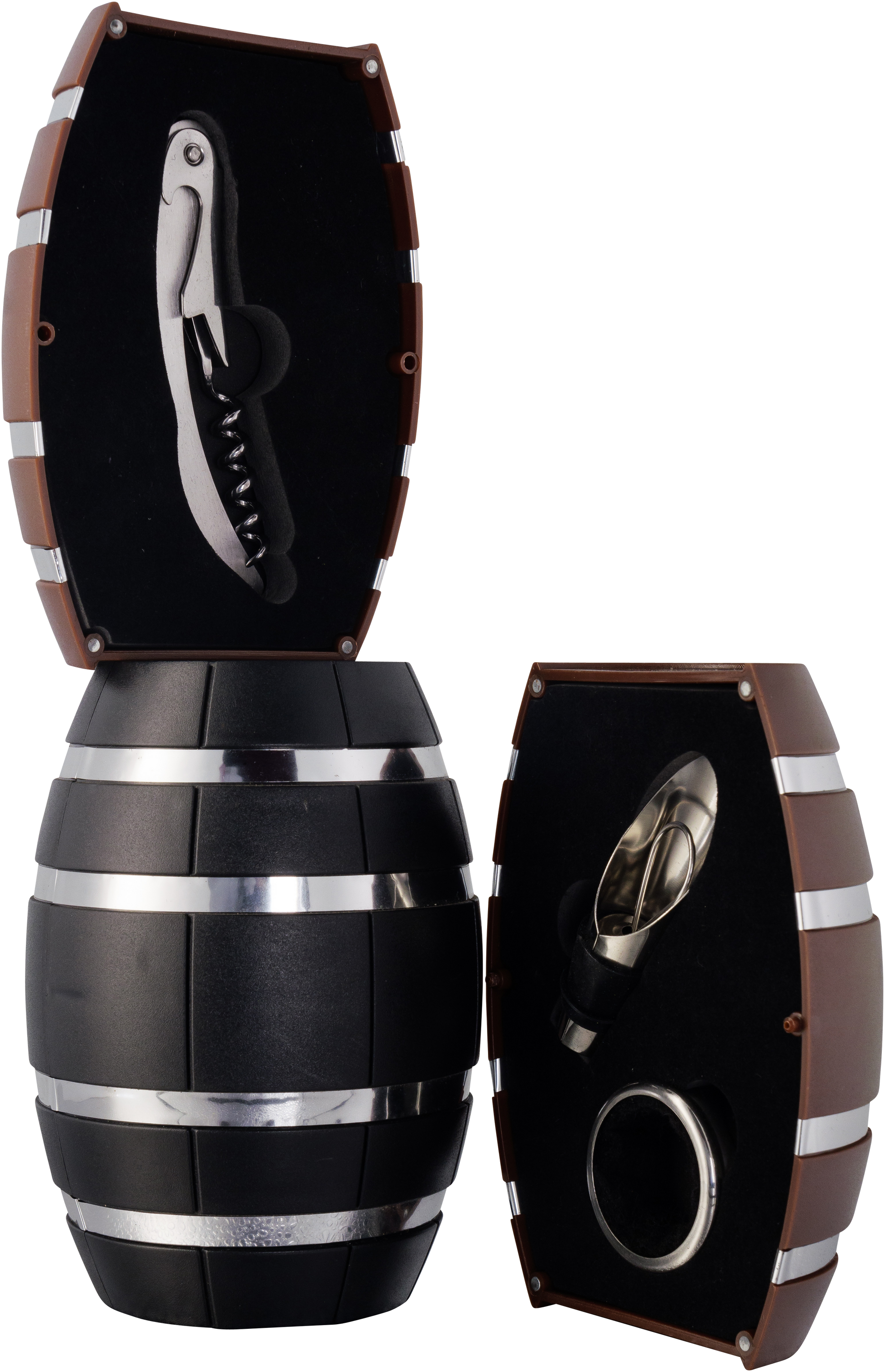 Unser kleines Dekofass vereint praktisches Zubehör und stilvolles Design: Es kommt inklusive integriertem Flaschenöffner und einem hochwertigen Weinbesteck.